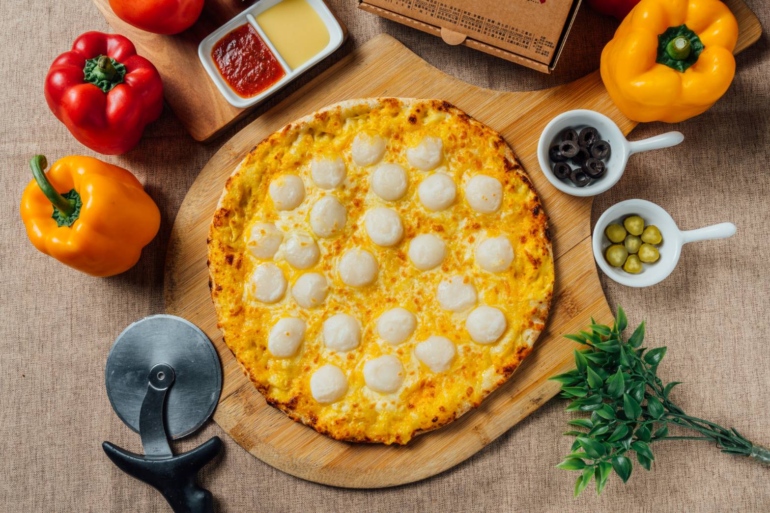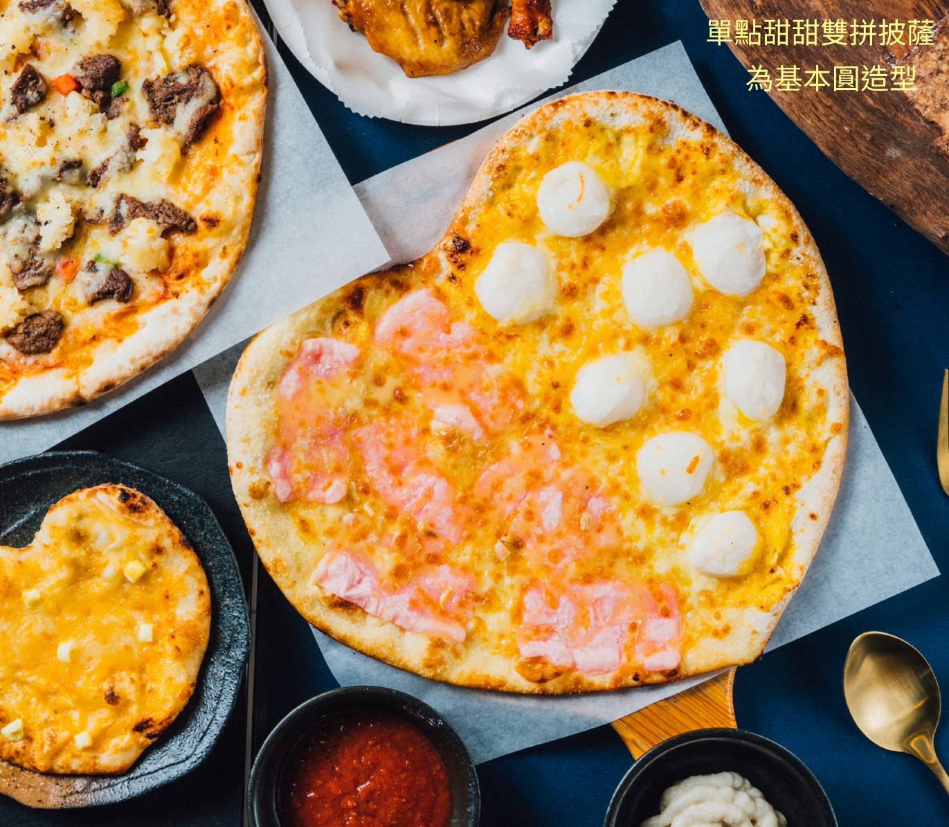雙色起士(摩佐瑞拉/切達起士)、愛心麻吉、煉乳、特製奶油醬、烤糖